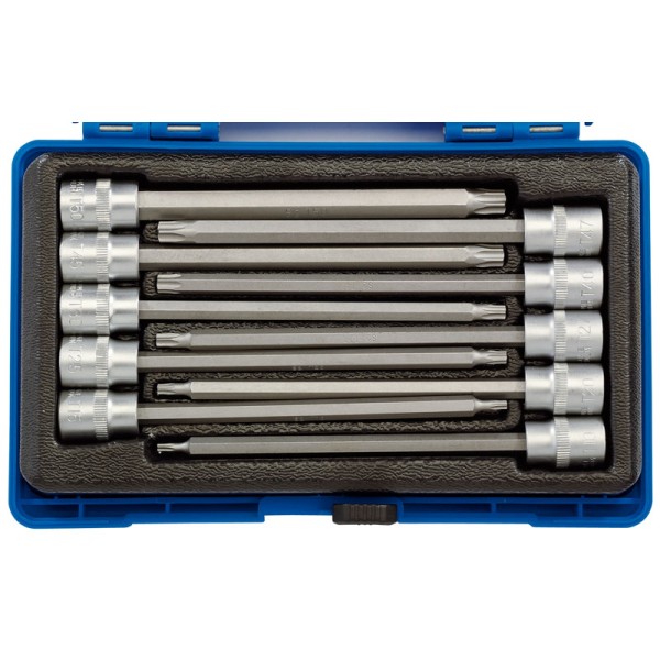 Expert Quality, 10 Draper TX-STAR® socket bits, 150mm long. All sockets manufactured from hardened and tempered chrome vanadium steel with sand blasted bits of S2 silicon steel. Each socket has a knurled ring for extra grip. Supplied in a plastic storage case. Display packed.