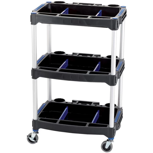 Plastic shelves with aluminium uprights, comprising three shelves each with three compartments with removable dividers, six screwdriver holding slots, four additional compartments, two cup holders and a cable tidy. Two fixed and two lockable swivelling castor wheels. Supplied flat packed with instruction booklet. Carton packed.