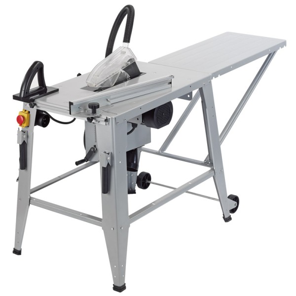 Ideal for workshop use, with the added benefit off being fitted with large rear wheels, perfect for transporting to and from different work sites. The large extension table can be fitted to the side or the rear of the saw for added flexibility. Supplied with: 40T TCT blade, mitre guide, dust extraction hose. push stick and moulded cable and approved plug.