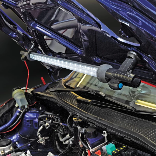 Manufactured with magnetic swivel end caps enabling the lamp to be attached to metal surfaces, also fitted with a under bonnet hanger for attaching to car bonnets. Unit can swivel 120° in its holder and switches between 36 SMD's (600 lumens) or 16 SMD's (300 lumens). Fitted with Ni - MH integral battery providing up to four hours continuous usage. Supplied with BS approved 3 pin 230V charger.