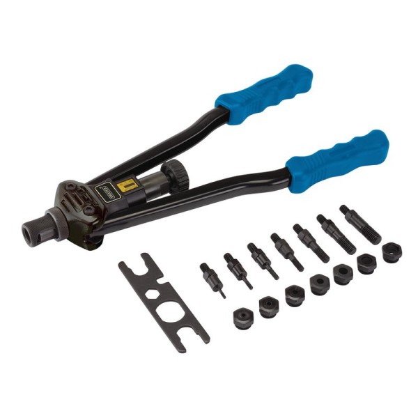 This robust long-arm threaded nut riveter is suitable for rivet nuts in aluminum, steel and stainless steel. The long arms offer effortless functionality and allow access to hard-to-reach restricted areas. Steel riveter head and steel arms, with PVC moulded hand grips. Fitted with thumbwheel to unscrew the threaded nut rivet. The set includes seven rivet nut adaptors - M3, M4, M5, M6, M8, M10, and M12. Length 410mm.