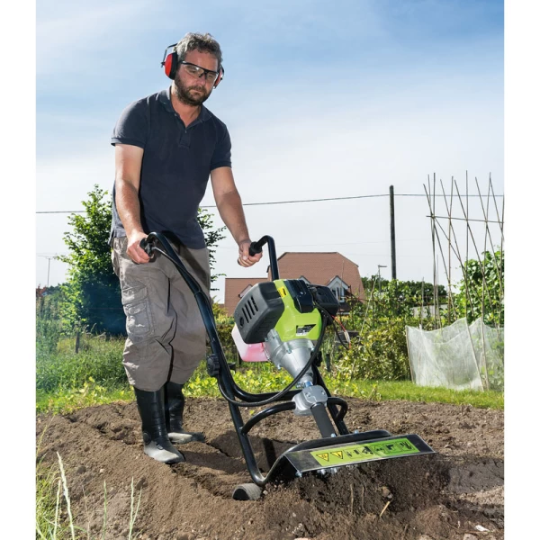 This lightweight garden tiller and cultivator is a suitable rotavator for preparing soil for flowers or vegetables. It is powered by a 2-stroke single cylinder petrol engine, with a recoil start. The machine has a working width of 320mm and has 6-tooth blades that are effective in all soil types. It has handlebar steering for maximum control and an easy-reach throttle to adjust the rotation speed of the tines. Height adjustable tilling depth up to 150mm. The handlebars can be positioned at two different heights and have comfortable handgrips. Fitted with transport wheels for manouverability and folding handlebars for easier storage. Compatible with E10 fuel and requires 2-stroke oil to be added.