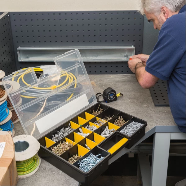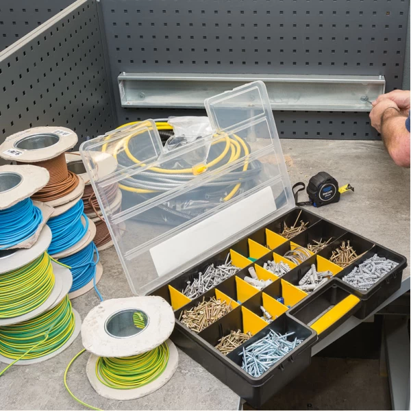 Plastic organiser with an adjustable matrix of storage compartments. The 21 removable dividers can make from 5 to 26 compartments. Case has a carrying handle with 'snap fit' closures and clear lid. Sold loose.