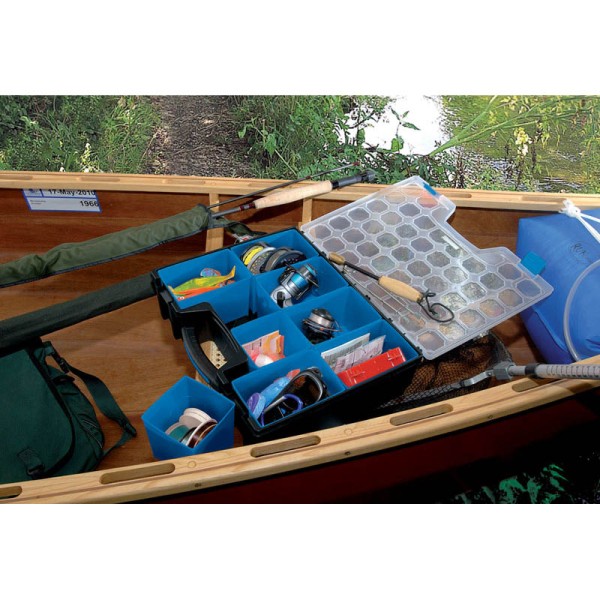 Plastic organiser with an adjustable matrix of lift-out storage compartments. Case has a carrying handle with 'snap fit' closures and clear lid. Sold loose.