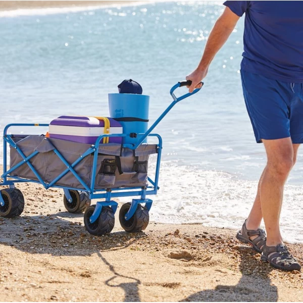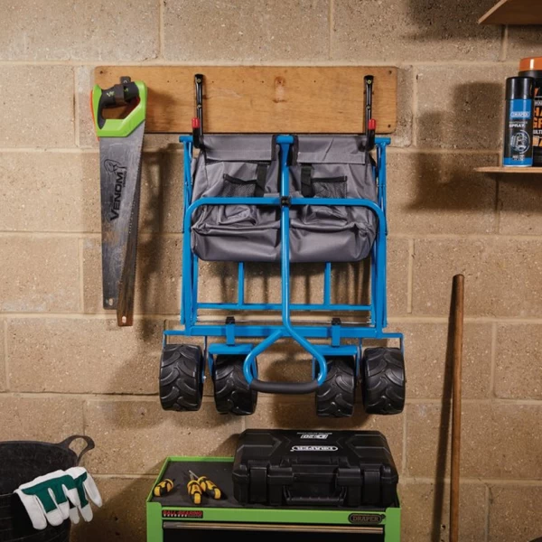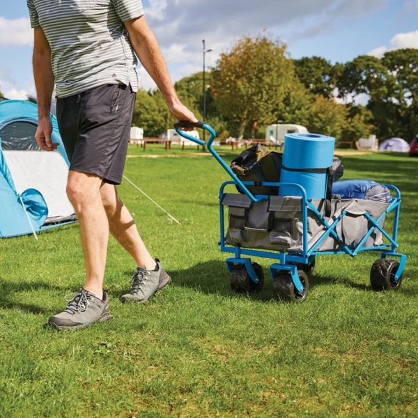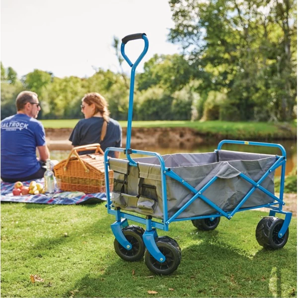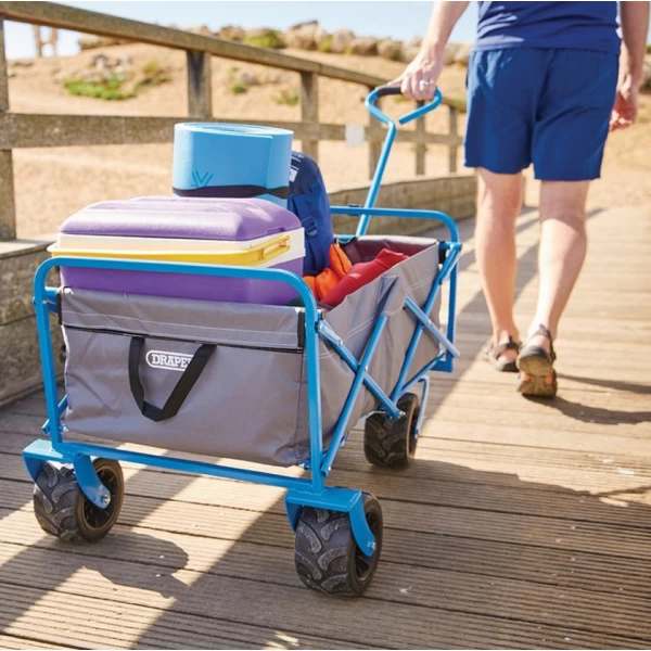 This strong folding cart has a steel construction and internal double liner for extra strength. The large, sturdy wheels are easy to direct using the pull handle, and there is a durable EVA foam grip for comfort when pulling. This cart folds for easy storage when not in use and for transportation. It is ideal for use on-site, gardening and family outdoor activities such as camping, festivals and beach days. Maximum load 80kg.