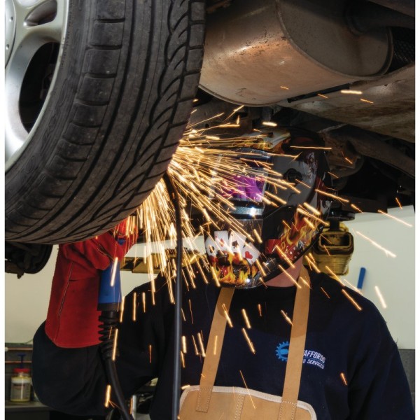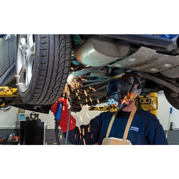 This auto-darkening welding helmet instantly switches on when the arc is struck and rapidly changes to 9-13 shade level. The dark shade, sensitivity and delay time are adjustable using control knobs. The helmet is powered by a solar cell and a lithium-ion battery (replaceable). The 92.5 x 42.5mm viewing area provides very good visibility of the weld zone. It is suitable for TIG, MIG and arc welding, plasma cutting and also grinding. The comfortable headband is adjustable using the knob to enable an optimal fit.