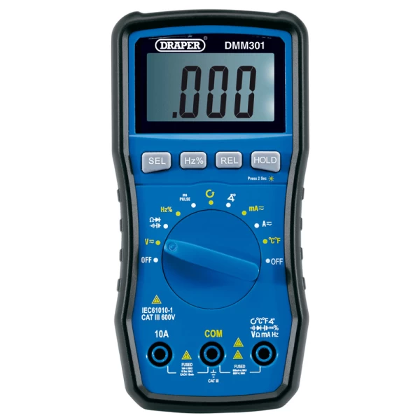 Auto and manual ranging multimeter capable of voltage, current, resistance, diode, temperature and continuity testing. Fitted with a backlit LCD screen, DWELL, Tach, MAX, auto power off, continuity buzzer and data hold features. Supplied with test leads, temp probe, inductive clamp, case and 2 x AAA batteries.