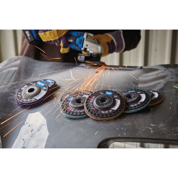 This polycarbide strip disc is made from black silicon carbide, which is softer and more flexible than other abrasive materials making it better suited for light work and contoured surfaces. Ideal for general cleaning applications, rust and paint removal, and surface preparation whilst reducing damage to the workpiece. Compatible with 115mm angle grinders including Stock No. 56488.