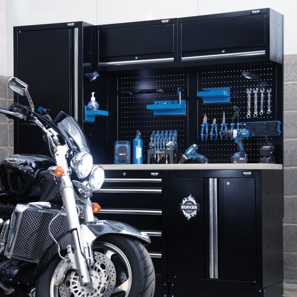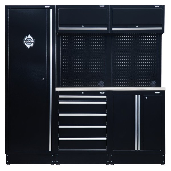 Part of the BUNKER® modular storage system. This stunningly designed combo is easily installed inside a garage or workshop to create your ideal storage system. All units are made from premium-quality steel and have a durable matt black textured industrial powder-coated finish. The floor cabinets are covered by a stylish stainless steel worktop and provide incredibly versatile storage, featuring large cupboards with fully adjustable shelves and smooth soft-close drawers lined with lush foam to protect your tools. The fixed base cabinets have adjustable feet for optimal positioning on an uneven floor. All wall cabinets have lift-up doors for convenient access, operated by whisper-quiet gas struts. For added storage, the back panels act as pegboards, and each includes one pre-cut hole for access to a power supply. Each unit has an integral lock for security and two keys are supplied. The combo comes with all the required fittings for simple installation. For your quality assurance, all BUNKER® units include a 10-year warranty. Every combo includes a free magnet of the distinctive BUNKER® logo.