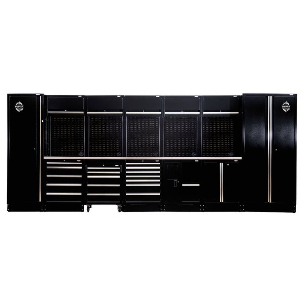 Part of the BUNKER® modular storage system. This stunningly designed combo is easily installed inside a garage or workshop to create your ideal storage system. All units are made from premium-quality steel and have a durable matt black textured industrial powder-coated finish. The floor cabinets provide incredibly versatile storage, featuring large cupboard spaces with fully adjustable shelves and smooth soft-close drawers lined with lush foam to protect your tools. They also offer a functional workspace with stainless steel worktops and an integrated rubbish bin and paper towel roll holder, plus a mobile cabinet with five drawers. The fixed base cabinets have adjustable feet for optimal positioning on an uneven floor. All wall cabinets have lift-up doors for convenient access, operated by whisper-quiet gas struts. For added storage, the back panels act as pegboards, and each includes one pre-cut hole for access to a power supply. Each unit has an integral lock for security and two keys are supplied. The combo comes with all the required fittings for simple installation. For your quality assurance, all BUNKER® units include a 10-year warranty. Every combo includes a free magnet of the distinctive BUNKER® logo.