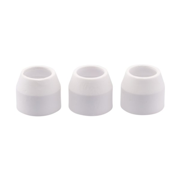 A pack of three ceramic shrouds for the 80A Plasma Cutting Torch (Stock No. 03358). The shrouds are also suitable for use with the cutting torch supplied as part of the 60A High Frequency Plasma Cutter (Stock No. 70058).