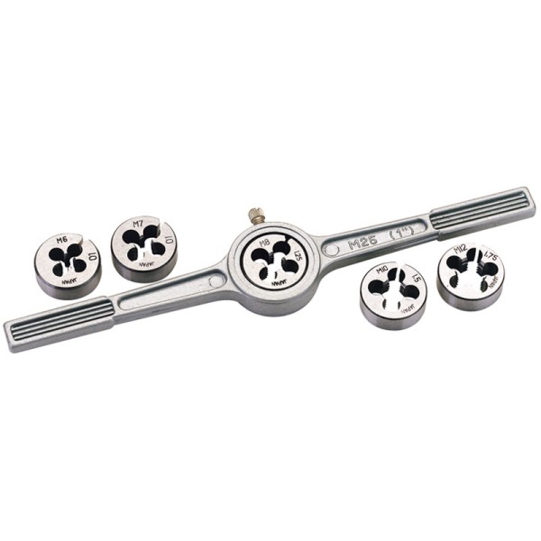 Popular sizes of 1" O/D circular split dies and die holder. Ideal for clearing threads. Manufactured from carbon steel with cut threads. Display packed.