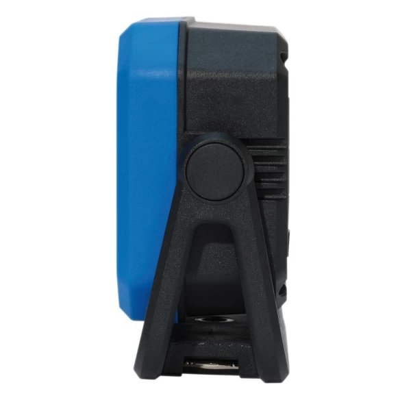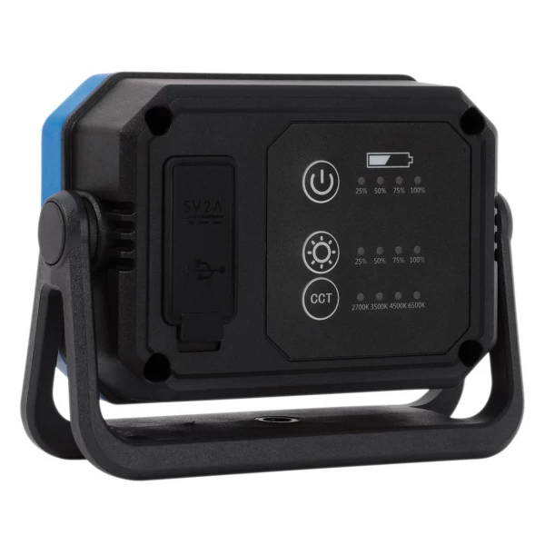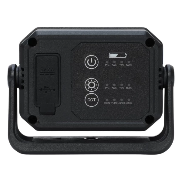 This rechargeable work light has an additional spotlight and can also be used as a power bank to charge mobile devices while on the go. It is highly versatile and comes with an adjustable stand that can rotate 360°. Additionally, it features strong mounting magnets in the base and hanging hooks for hands-free use. The work light has four brightness settings - 25%, 50%, 75%, and 100%, and the CCT (Correlated Color Temperature) can be adjusted between 2,700-6,500K. It is powered by a rechargeable lithium-ion battery and includes a USB port for easy charging using the provided USB-C cable. Furthermore, it has an LED indicator to display the battery capacity and charging status. Constructed from durable plastic, it is designed to withstand a 1m drop.