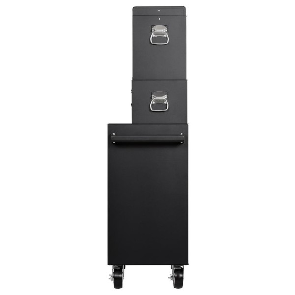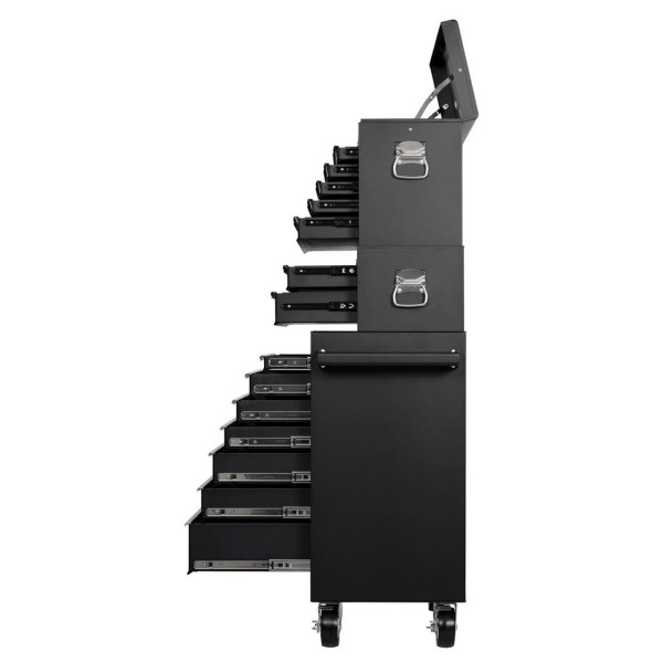 This workshop and garage storage solution features a mid tool chest with two drawers and a tool chest with five drawers and lift-up top, as well as a roller cabinet with 7 drawers. They can be used individually or combined to suit the task at hand. Both are constructed from sheet steel and have a protective powder coated finish that guards against scratches and corrosion. The spacious drawers have a stylish silver trim and are equipped with ball bearing sliders for smooth operation, along with a 2mm EVA liner to protect tools and prevent them from sliding around. For easy manouverability, the tool chest includes side handles, while the roller cabinet is equipped with a sturdy pull handle and four large steel castors - two fixed and two swivel with brakes. For security, each unit has an integral lock to safeguard tools and each comes with two keys.