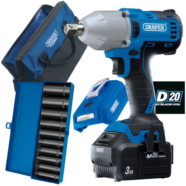 Draper D20 Brushless Impact Wrench (400Nm) with 3.0Ah Batteries, USB Adaptor + Socket Set has been added to your cart