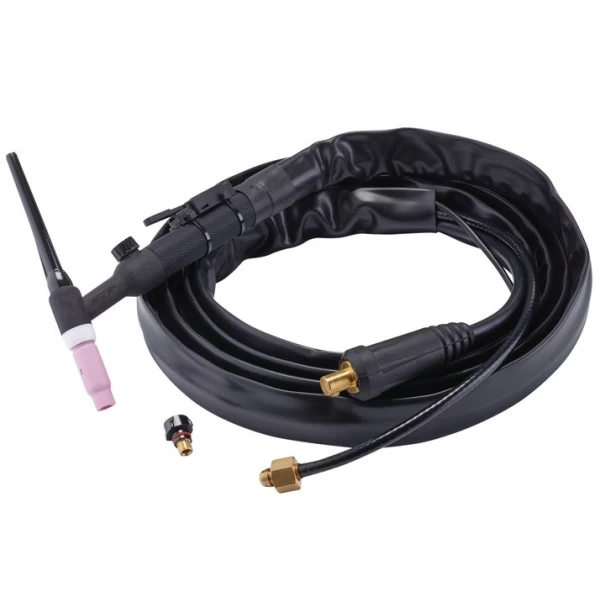 TIG welding torch with 35/50 Dinse type plug and 3/8" BSP fitting. Lightweight, durable and air cooled with rubber head mouldings for greater heat resistance. 4m cable. Suitable for TIG welding up to 250A.
