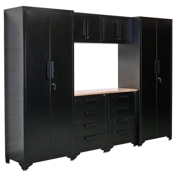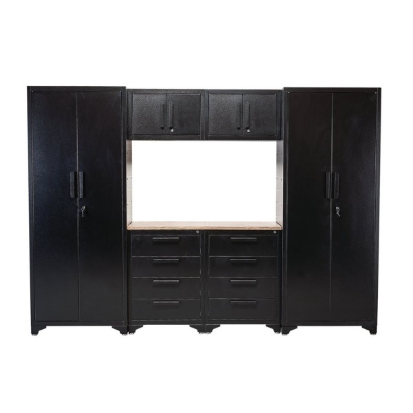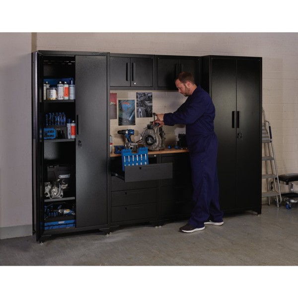 This complete steel storage unit combines two tall cabinets - each with two doors and three fitted shelves, two wall cabinets, two base cabinets with four drawers and a pressed wood worktop. It is styled with a matt black frame and powder-coated finish doors and is fitted with adjustable feet for stability. A fully lockable system is in place for security (six keys provided). Each unit is fully assembled and the workstation is supplied with all the fittings for a simple installation. This is a complete storage solution (individual components are not available separately).