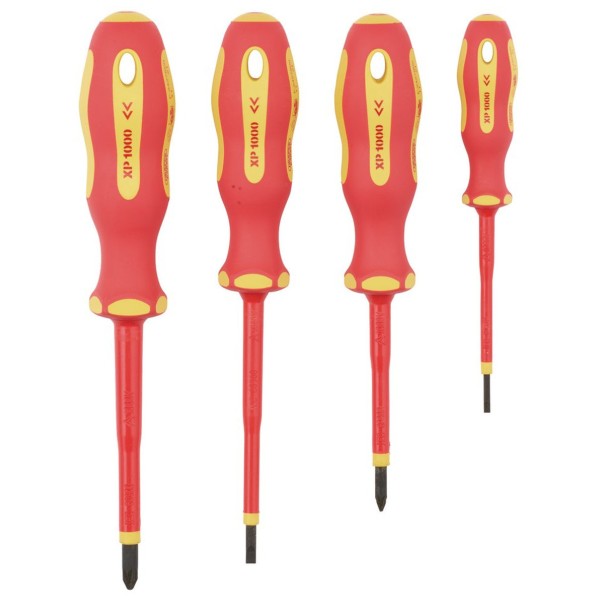 Expert quality XP1000®, a set of commonly used screwdrivers with patented dual-layer insulation, which makes any damage highly visible. Individually tested to 10,000V, suitable for working on live circuits of 1,000V AC and 1,500V DC. Ergonomic soft grip bi-material handle allows free spinning in the palm of your hand to quickly tighten screws, but also allows transfer of torque when needed. Designed with flat sides to prevent them from rolling. SCVM steel blades hardened, tempered and chemically blackened with precisionly machined tip for exact fit to prevent screw damage.