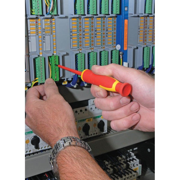 Expert quality XP1000®, interchangeable screwdriver set with a comprehensive selection of screwdriver tipped blades for electrical applications. Includes a circuit tester for additional safety and peace of mind. The handle and blade sleeve is moulded in two pieces, enabling the blades to be fitted deep into the handle ensuring there's no "flashover". Ergonomic soft grip bi-material handle allows free spinning in the palm of your hand to quickly tighten screws, but also allows transfer of torque when needed. Individually tested to 10,000V, suitable for working on live circuits of 1,000V AC and 1,500V DC. The VDE interchangeable blades are made from SVCM steel for added strength and deliver a fast and easy press-in auto lock action with a simple release method. An additional precision screwdriver handle and 240V mains tester allow complete versatility with one set. Supplied in a convenient carrier for secure transportation and storage.