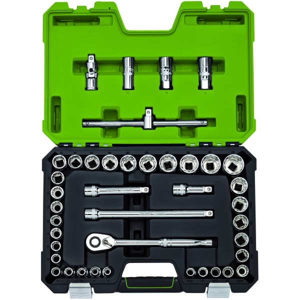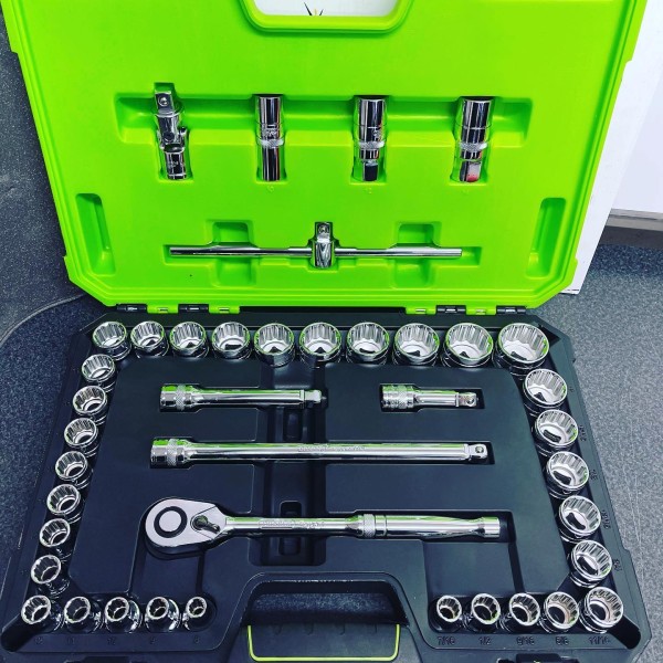 Expert Quality, twelve point sockets made from chrome vanadium steel that's hardened and tempered with a polished finish. Each socket has a knurled ring for extra grip. Supplied with a 72 tooth reversible ratchet and accessories. Packed in a tough plastic storage case with soft grip handle.