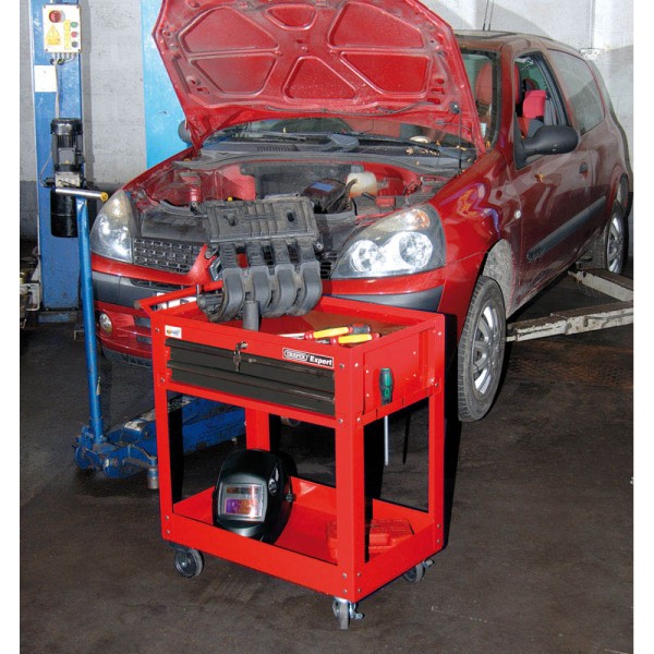 Expert Quality, mobile workshop trolley with two full width lockable drawers on ball bearing runners.for smooth operation. Manufactured from heavy duty steel with a powder coated protective finish. Fitted with handle and four castors (two fixed and two swivelling). Secure integral locking system supplied with two keys. Carton packed .