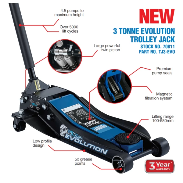 A superior 3-tonne trolley jack designed for professional use. The unique design and extra-wide base increases stability when in operation and the extremely large twin-piston 'Quick Lift' facility enables the jack to reach full height in 4.5 strokes. The ram and pump units are fitted with premium seals for enhanced performance and lifespan. Attached with a magnetic filtration system ensuring the pumps hydraulic oil is consistently kept free of contaminates, greatly improving the jacks lifespan. The 5 grease points ensure the lifting arm and axles are continuously lubricated, whilst the integrated rubber saddle pad helps prevent damage to the underside of vehicles. The twin safety overload valves deliver added safety when in use. All these features wrapped up in a 3-year warranty for total peace of mind.