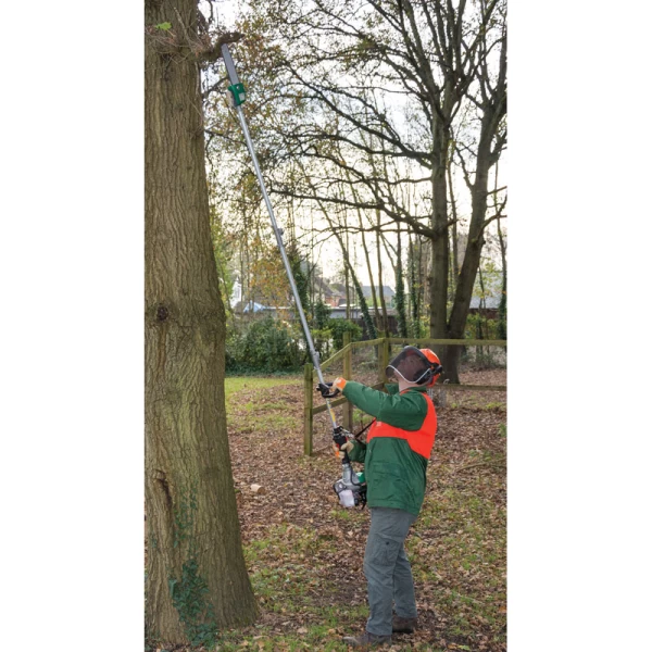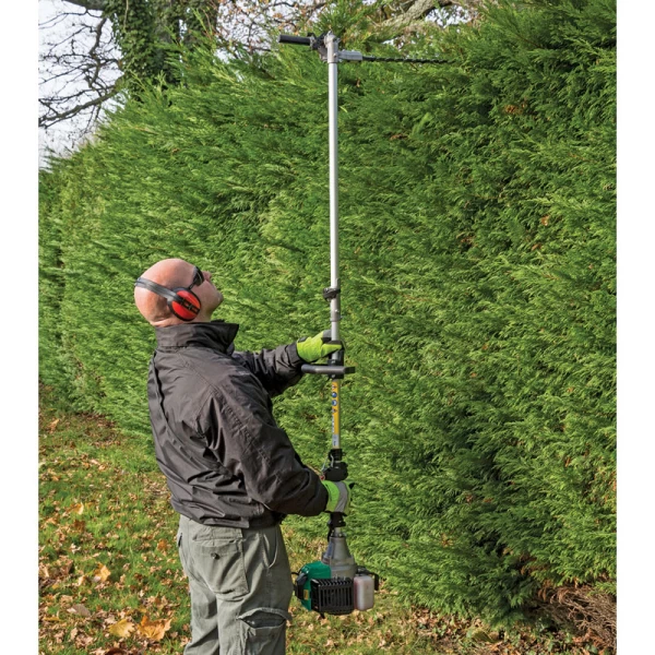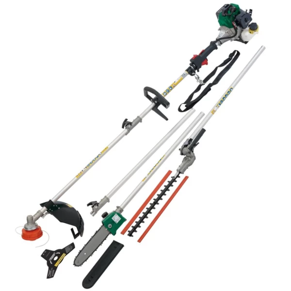 Four attachments for different tasks around the garden, 2 stroke petrol engine, Fitted with an easy start recoil system, Electronic ignition, Choke for easy starting, On/off switch with operator safety trigger, Split shaft for ease of transport, Adjustable D type soft-grip handle, 'Tap and Go' line feed, Single strap shoulder harness with a quick-release mechanism, Supplied with attachments; grass trimmer/brush cutter, pruner/saw, hedge trimmer and extension pole