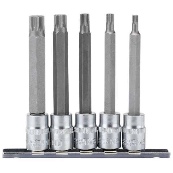 Expert Quality, 5 spline socket bits, 100mm long. All sockets manufactured from hardened and tempered chrome vanadium steel with sand blasted bits of S2 silicon steel. Each socket has a knurled ring for extra grip. Supplied on a steel socket retaining rail. Display packed.