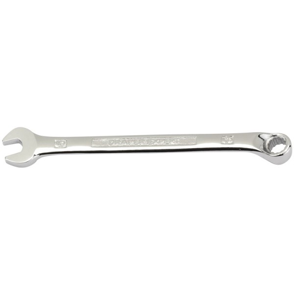 Expert Quality, with Draper Expert HI-TORQ® deep offset ring end cranked at 15°. Open end set at 15°. Long pattern forged from chrome vanadium steel, hardened, tempered, chrome plated and fully polished throughout. Display packed.
