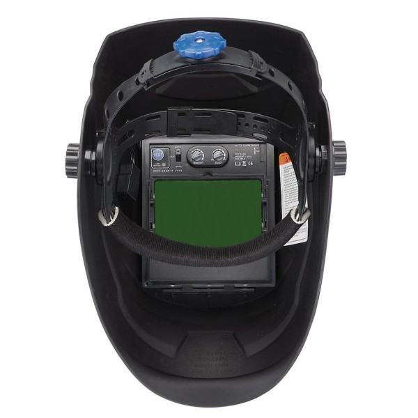 This auto-darkening welding helmet instantly switches on when the arc is struck and rapidly changes to the required amount of shade. The shade coverage includes 4, 5-9 and 9-13. The sensitivity is adjustable using the control panel and there is also a dark to light delay (stepless) function. The helmet is powered by a solar cell and lithium-ion battery (replaceable) for fast switching and low amp sensitivity. The 100 x 67mm viewing area provides decent visibility of the weld zone. It is suitable for TIG, MIG and ARC welding, plasma cutting and also grinding using the dedicated setting. The comfortable headband is adjustable using the knob to enable an optimal fit.
