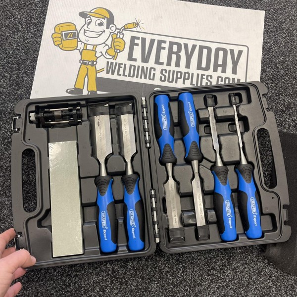 Comprising six chisels (blade widths: 6, 12, 20, 26, 32 and 38mm), honing guide and aluminium oxide sharpening stone. Chisels have full length bevel edged blades, manufactured from chrome vanadium steel hardened, tempered, finely ground and clear lacquer coated for corrosion protection. Impact - resistant soft grip polypropylene handles. in blow mould case.