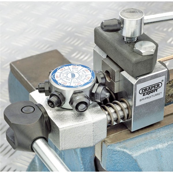 Expert Quality, for SAE convex, DIN convex and SAE double flaring on brake pipes. Performs single and double flares with ease. Mounts in a bench vice for secure accurate use. Rotating turret selector for ease of use when choosing the relevant punch in creating flares. Supplied with three sets of interchangeable forming blocks for rapid set up. Display packed in blow mould case.