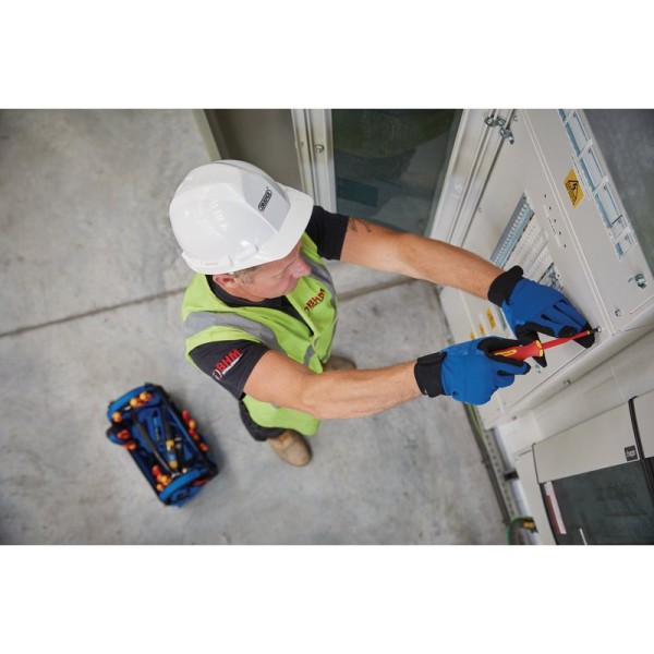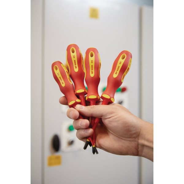 Expert quality XP1000®, slimline blade with an insulated sheath the same diameter as the blade, enabling the tip access to deep-seated screws found in terminals and switchboards. Individually tested to 10,000V, suitable for working on live circuits of 1,000V AC and 1,500V DC. Ergonomic soft grip bi-material handle allows free spinning in the palm of your hand to quickly tighten screws, but also allows transfer of torque when needed. Designed with flat sides to prevent them from rolling. SCVM steel blades hardened, tempered and chemically blackened with a precision-machined tip for an exact fit to prevent screw damage.