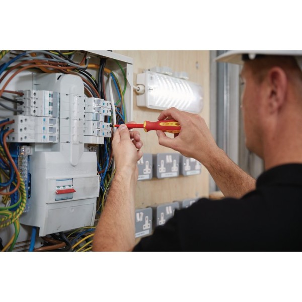 Expert quality XP1000®, slimline blade with an insulated sheath the same diameter as the blade, enabling the tip access to deep-seated screws found in terminals and switchboards. Individually tested to 10,000V, suitable for working on live circuits of 1,000V AC and 1,500V DC. Ergonomic soft grip bi-material handle allows free spinning in the palm of your hand to quickly tighten screws, but also allows transfer of torque when needed. Designed with flat sides to prevent them from rolling. SCVM steel blades hardened, tempered and chemically blackened with a precision-machined tip for an exact fit to prevent screw damage.
