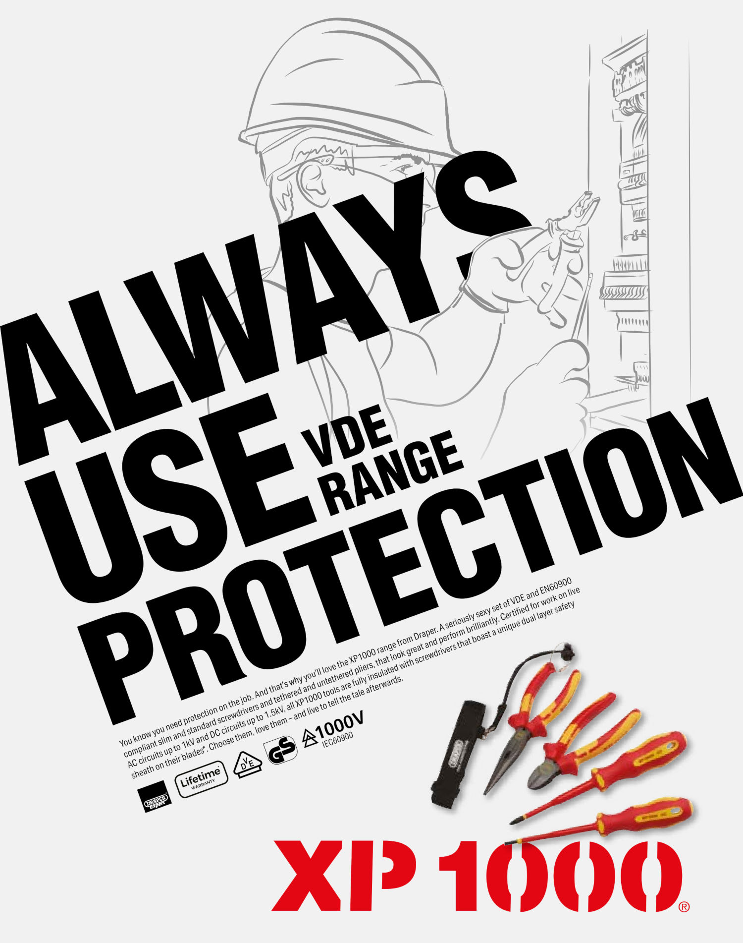Check out the NEW XP1000 range from Draper. A stunning range of seriously sexy screwdrivers, pliers (including tethered options), and kits. All fully VDE and EN60900 compliant. With distinctive styling. And patented safety features. Now, electricians can get all the choice and all the protection they need. With so much on offer, what’s not to love?