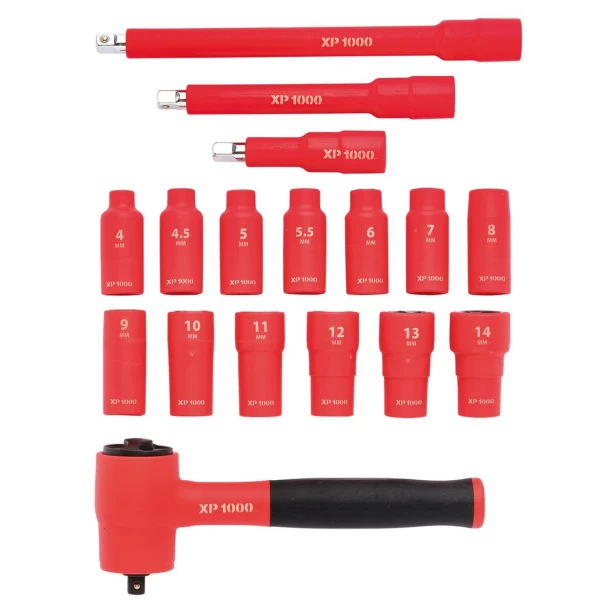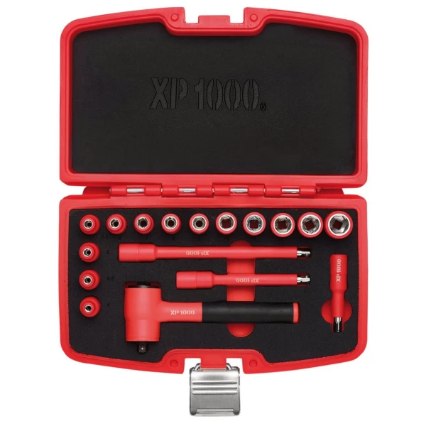 Draper Expert XP1000® quality. This VDE socket set is ideal for hybrid and electric car servicing and maintenance, plus electricians and other trades working on live circuits. Each component is insulated and tested to 10,000V for safe working on live circuits of 1,000V AC and 1,500V DC. There are thirteen 6-point sockets - sizes 4, 4.5, 5, 5.5, 6, 7, 8, 9, 10, 11, 12, 13, 14mm. The reversible ratchet has a quick-release mechanism and 45-teeth enabling 8° movement. Finally, the set includes three extension bars - 50, 100, 150mm. The sockets and extension bars are forged from chrome vanadium steel, while the ratchet is made from high-quality carbon steel. Supplied inside a sturdy plastic storage case with an integrated handle.