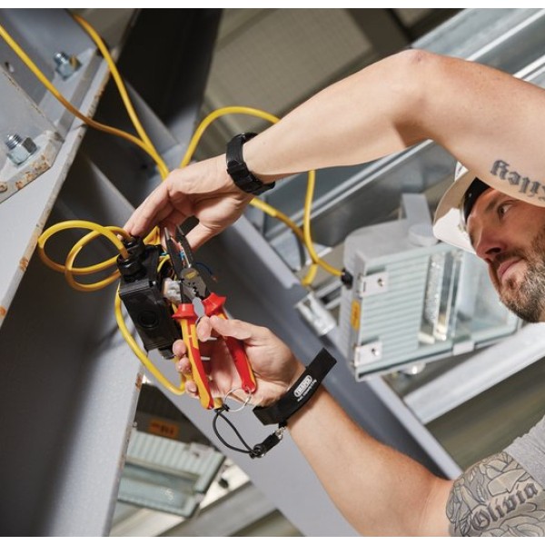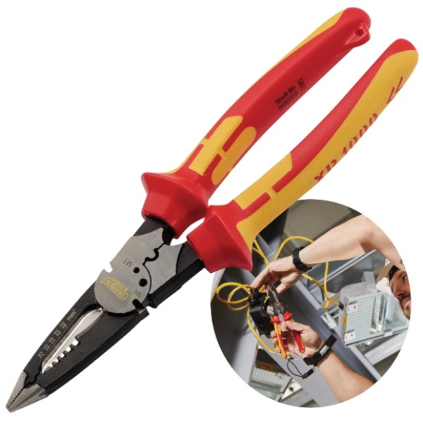 Expert quality XP1000®, manufactured from premium steel. Featuring many features in one tool for the electrician on site. Includes features for cutting cables, wire stripping notches (0.75–4.0mm2), terminal crimping (0.75, 1.0, 1.5, 2.5, 4.0mm2), pattress screws shearing 3.5mm and 4.0mm panel screws. Long nose for grabbing and looping wires. A two-part bi-material ergonomic soft grip handle allows maximum grip and user comfort, and horns prevent slipping onto live conductors. Tested to 10,000V, these pliers are suitable for working on live circuits of 1,000V AC and 1,500V DC. The handle also incorporates a tethered fixing solution to comply with Work at Height Regulations (lanyard Stock No. 82474 and wrist strap Stock No. 03470 sold separately).