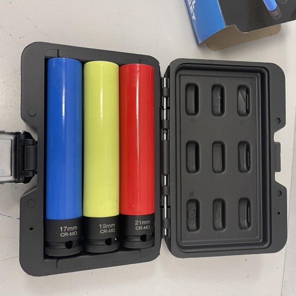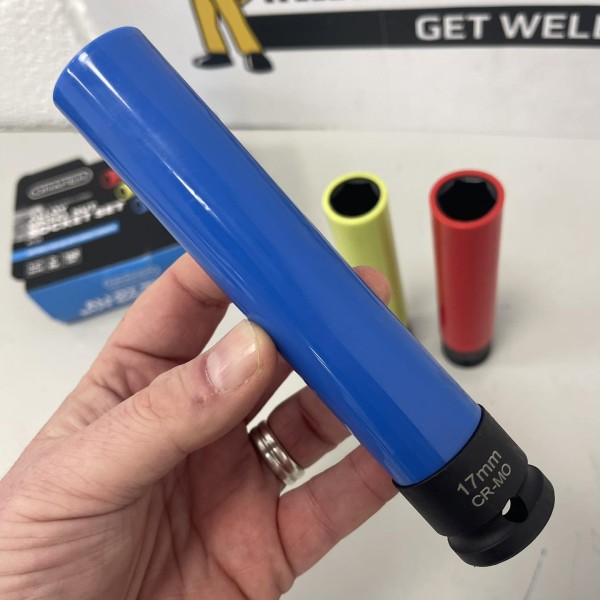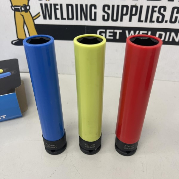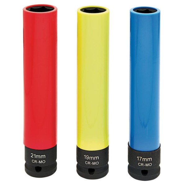 This set of 150mm thin walled wheel nut sockets is made from chrome molybdenum with black phosphate finish. Each socket has a protective nylon sleeve to prevent damage to wheels and is colour-coded for easy size recognition. They are suitable for use with impact wrenches and drivers. The set includes 17, 19, 21mm and comes supplied in sturdy plastic storage case.