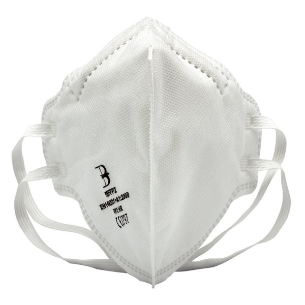 Disposable FFP2 face mask for protection against toxic dusts, fumes and water-based mists. These masks fold flat when not in use. FFP2 masks reduce the wearers’ exposure to airborne particles by a factor of 10.