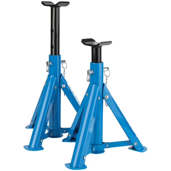 Axle stands with a hardened steel pin for increased safety, large feet and extra wide base for increased stability. Stands can be folded for storage purposes.