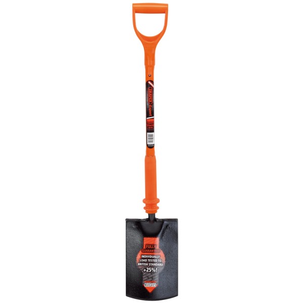 Expert Quality, fully insulated digging spade designed for working on or near live cable and wires. Individually tested to 10,000 volts, guaranteeing safe working on 1,000V and complying to the BS 8020: 2011 standards. Manufactured with an epoxy fibreglass core and attached to a fully enclosed insulated shaft with hand slip guard. Each digging spade is supplied with a certificate of conformity, which correlates with a unique traceability number embossed on the shaft. Sold loose.