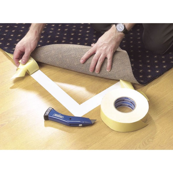 Heavy duty, double sided cloth tape suitable for various applications including fixing carpet to floors. Shrink wrapped in singles with label.