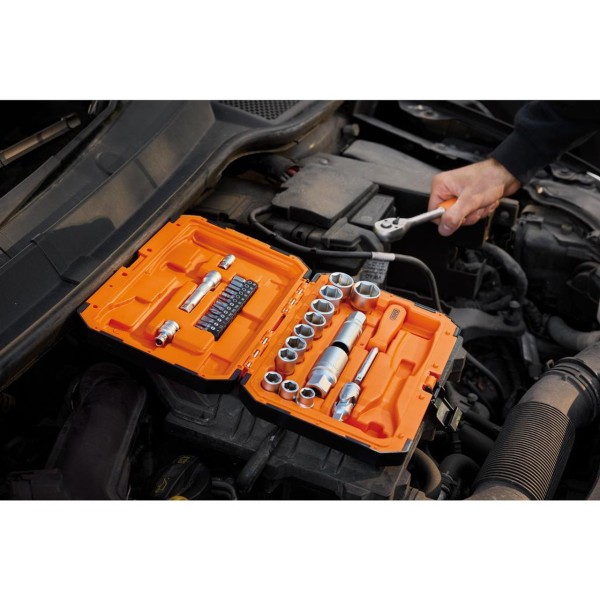 This 34-piece HI-TORQ® 6 point 1/4" and 3/8" socket set includes a quick-release ratchet. The set comes in a durable, robust case with a built-in handle and is suitable for use by all trade professionals and home DIY users. The sockets are manufactured from hardened and tempered chrome vanadium steel. The sockets and extension bars have a knurl finishing for ultimate grip, and the handles feature a TPR coating for added comfort.