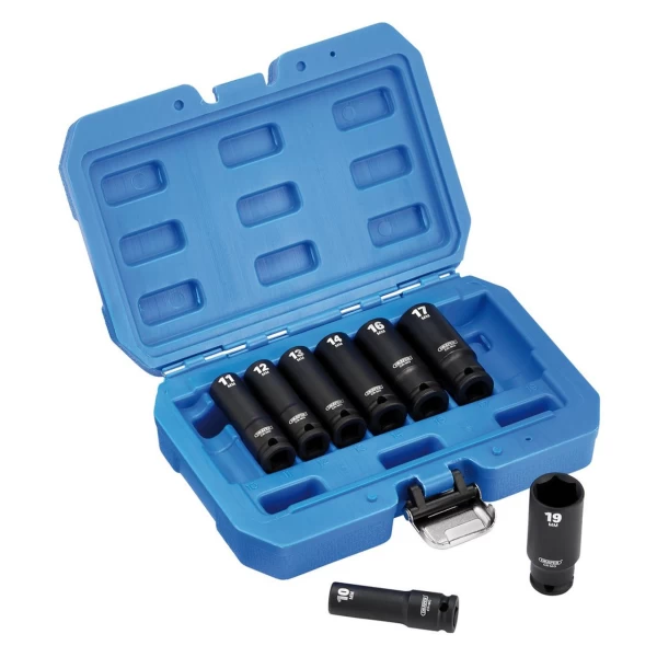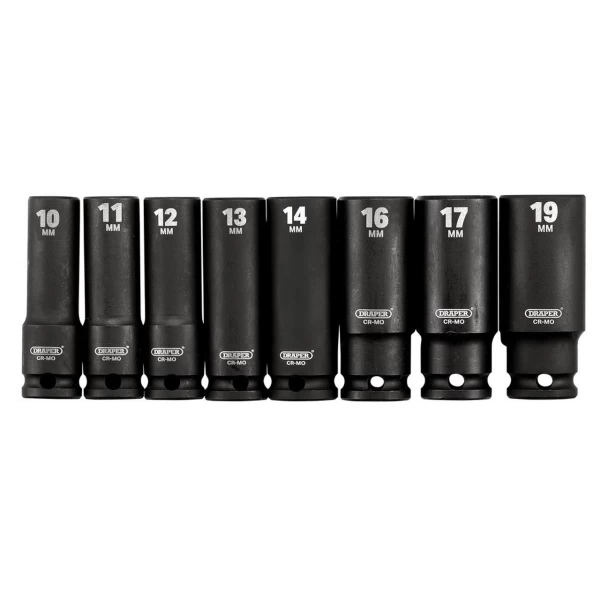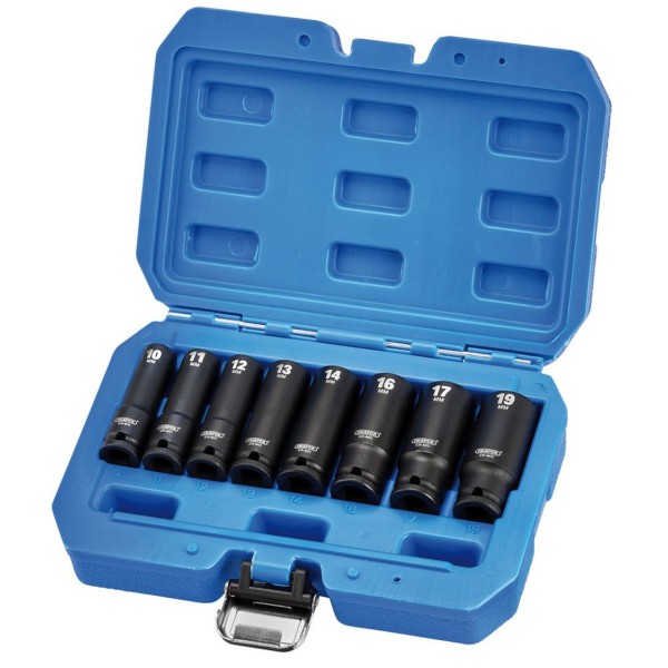These Draper HI-TORQ® 6-point deep impact sockets are forged from hardened chrome molybdenum. Black phosphate finish for corrosion protection. Includes sizes 10, 11, 12, 13, 14, 16, 17, 19mm. For use with electric or pneumatic impact wrenches with a 3/8" drive. Supplied inside a sturdy plastic storage case with metal hingle and buckle.