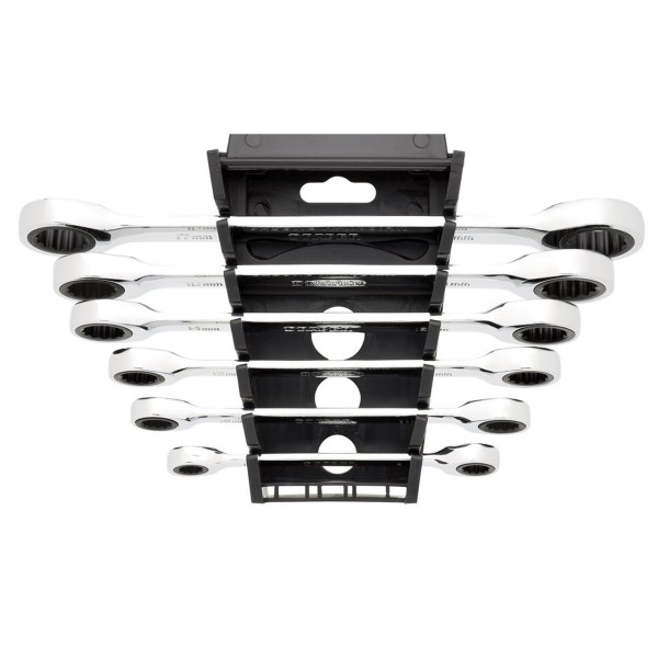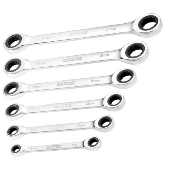 These Draper HI-TORQ® metric double ring ratchet spanners are forged from chrome vanadium steel that is hardened, tempered, fully polished and mirror chrome plated for corrosion protection. Both ring ends have a 90-tooth ratchet mechanism, and the 4° movement enables use in tight spaces. The 12-point HI-TORQ® delivers maximum leverage by transferring torque to the flats and preventing slipping or damage to the fastener. This six-piece set contains the full range.