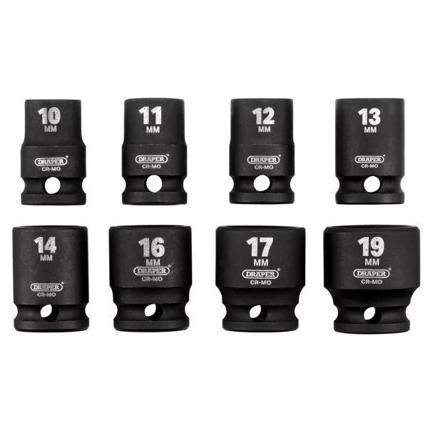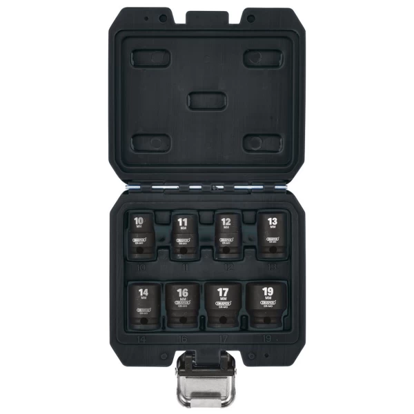 These Draper HI-TORQ® 6-point impact sockets are forged from hardened chrome molybdenum. Black phosphate finish for corrosion protection. Includes sizes 10, 11, 12, 13, 14, 16, 17, 19mm. For use with electric or pneumatic impact wrenches with a 3/8" drive. Supplied inside a sturdy plastic storage case with metal hingle and buckle.