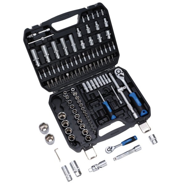 This socket set is made from chrome vanadium steel with a satin chrome finish. It includes a wide range of 1/4" Sq. Dr. and 1/2" Sq. Dr. 6-point HI-TORQ® sockets and deep sockets. The 72-tooth quick release ratchets and spinner handle are equipped with a soft grip handle for comfort. There is an array of socket bits, external sockets and 8mm hex bits. The set includes extension bars, spark plug sockets, universal joints, hex keys and more. All of these items are supplied inside a sturdy plastic storage case.