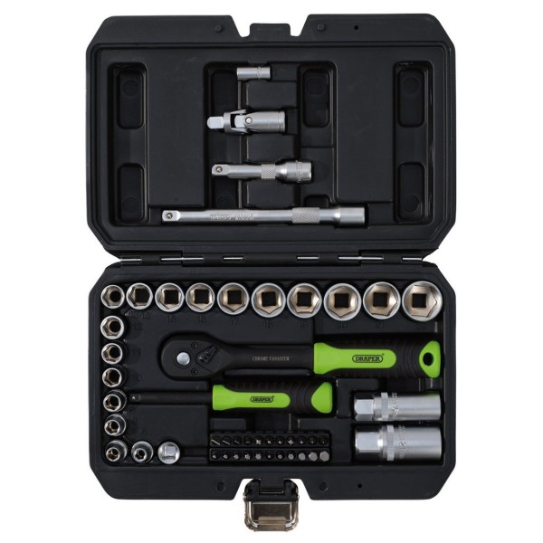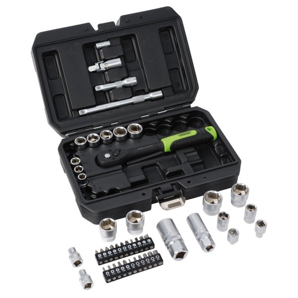 This socket and bit set is made from chrome vanadium steel with a satin chrome finish. It includes a wide range of 3/8" Sq. Dr. 6-point HI-TORQ® sockets in sizes 6-22mm. The 72-tooth quick release ratchet and 1/4" Sq. Dr. spinner handle are equipped with a soft grip handle for comfort. There is an array of hex bits made from chrome vanadium steel with a shot blasted finish. Additionally, the set includes extension bars (75, 150mm), spark plug sockets (16, 21mm), universal joint and drive adaptors. All of these items are supplied inside a sturdy plastic storage case.