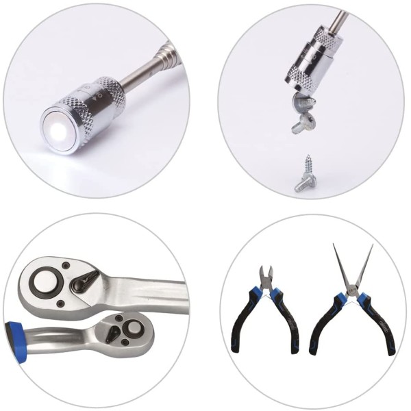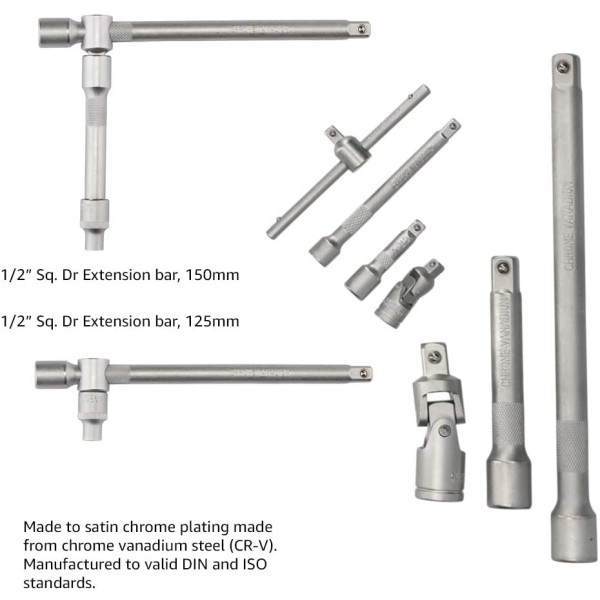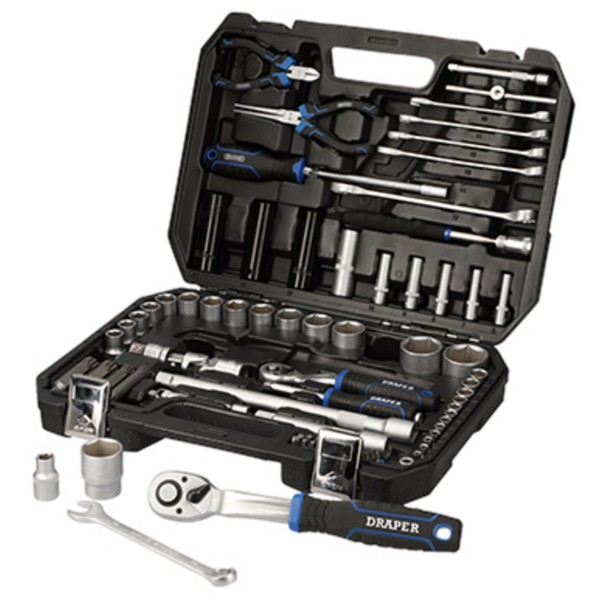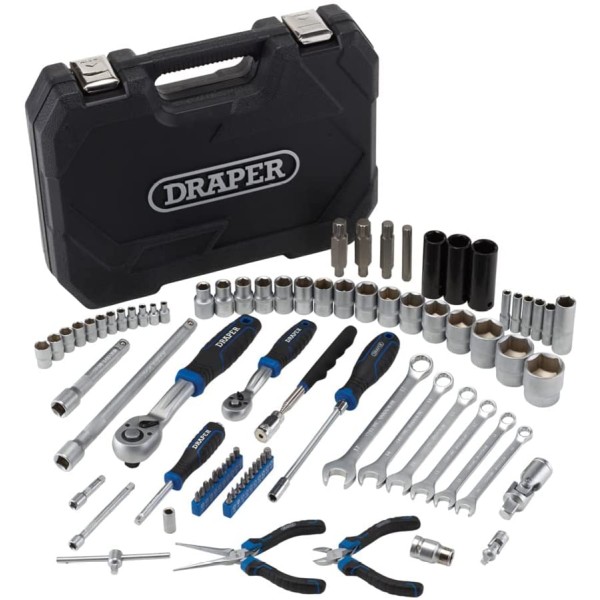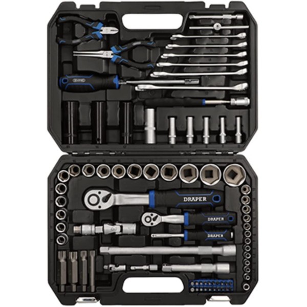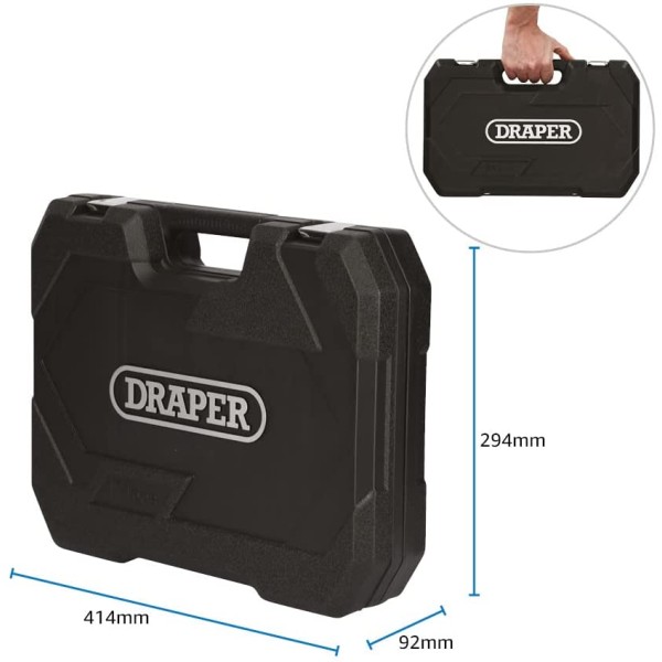 This high-quality metric socket set is made from chrome vanadium steel (CR-V) which is correctly hardened and tempered for strength and durability. The components are finished with satin chrome plating for corrosion protection. Manufactured and tested in accordance with valid DIN and ISO standards. The 1/2, 72-tooth ratchets are equipped with an easy-to-use reverse lever to change the direction. It has a quick-release button to allow the rapid locking and quick release of sockets. Fitted with an ergonomic soft grip handle. The Draper HI-TORQ® sockets deliver optimum leverage with minimal risk of damage. That is because they are engineered to securely grip the flats rather than the corners of the fixings. So, they are less likely to slip and there is less risk of stripping the edges – even if the fixings are already damaged. There is a selection of Draper HI-TORQ®® combination spanners with 12-point ring ends that are chamfered and deep offset at 15 degrees. This delivers maximum leverage by transferring torque to the flats. It also simultaneously prevents slipping or damage to the fastener. The open end is also offset at 15 degrees for easier working in confined spaces. A wide range of screwdriver bits is organised in its own plastic storage case. The bits are made from high-quality CR-V steel and have a shot blast finish. The set includes many attachments and tools, including universal joints, extension bars and a sliding T-bar. There is also a spark plug socket, pliers, flexible hose screwdriver, and a pickup tool with integral LED light for retrieving nuts and washers in poorly lit, tight areas. Supplied in a robust plastic case for ease of transportation and storage.