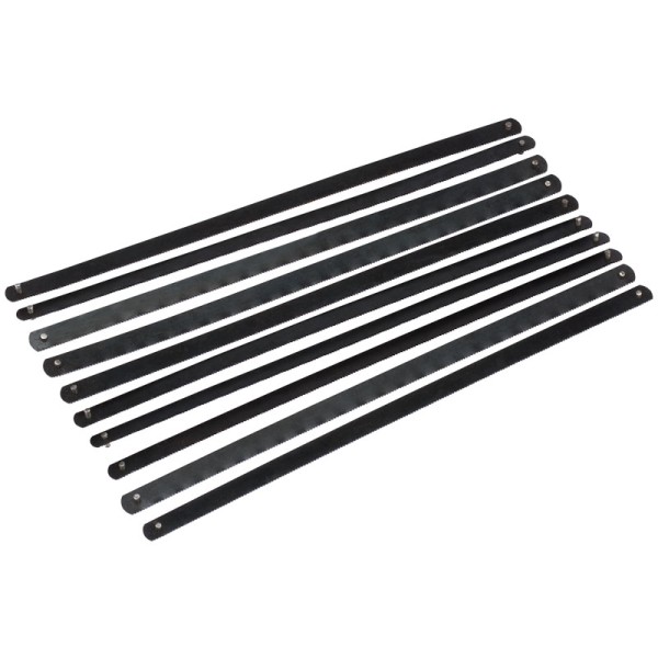 General purpose cutting blades with pinned ends. Manufactured from carbon steel, perfect for cutting mild steel or soft nonferrous metal. Packed ten blades per display card. Ideal for domestic or workshop/garage use.